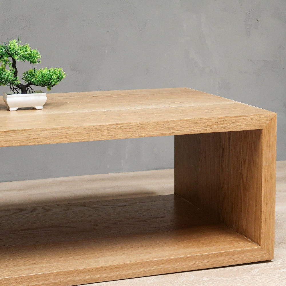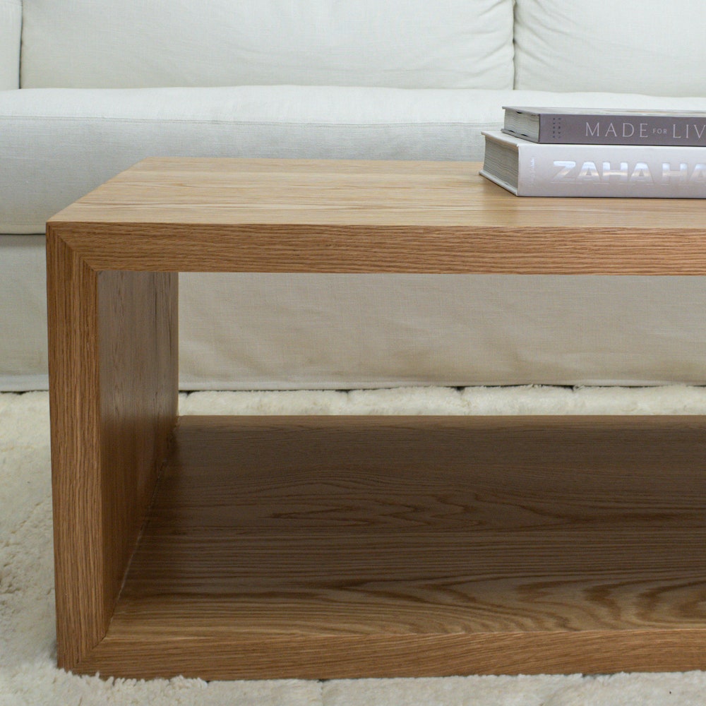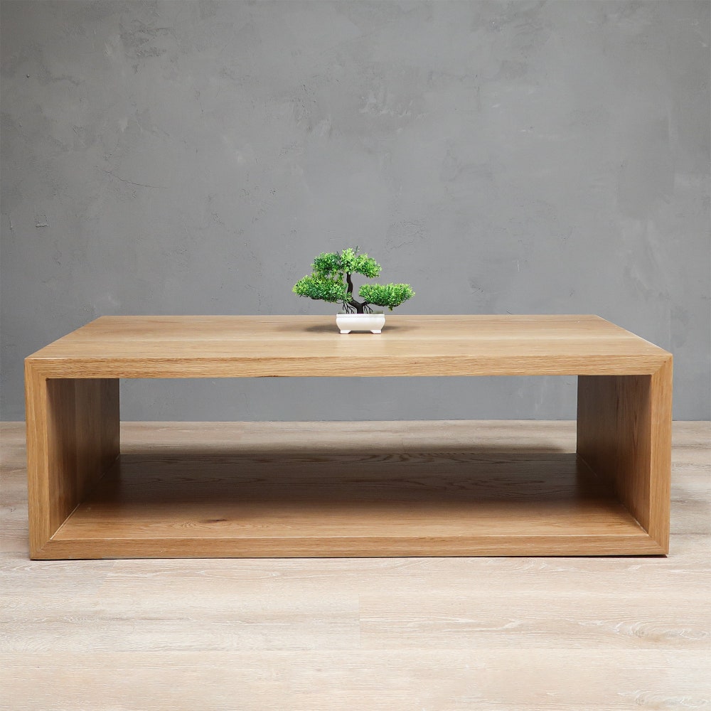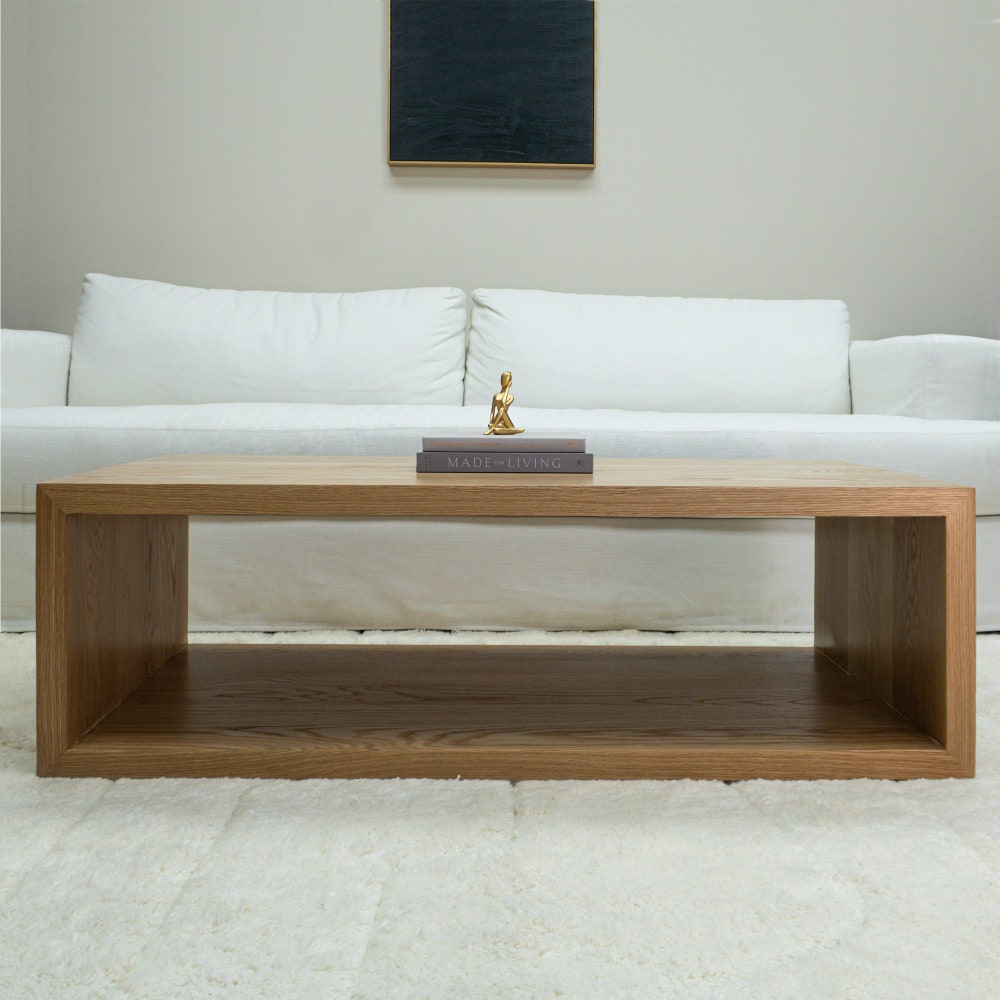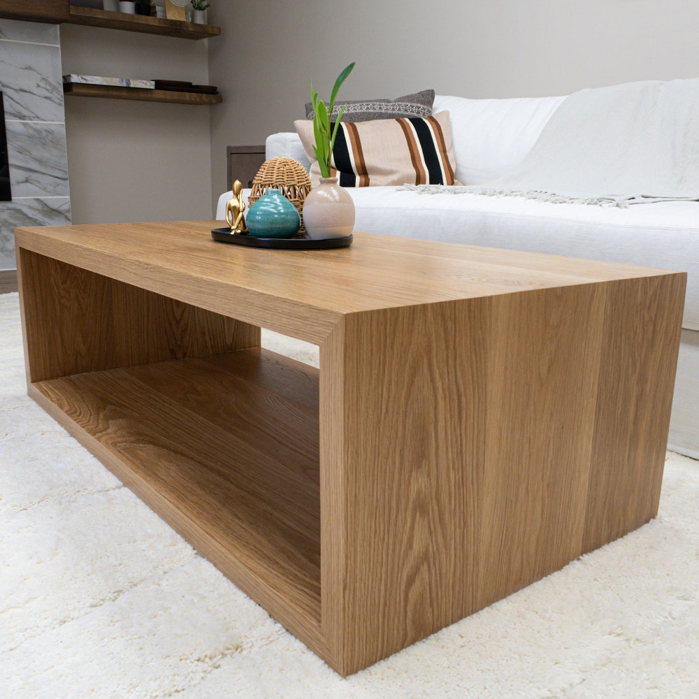 Our coffee tables are made in the USA of solid natural white oak hardwood. Natural white oak has one of the most beautiful grain patterns and is one of the most desired wood species. Due to the natural wood grain, your coffee table will be one of a kind as there is no other alike.