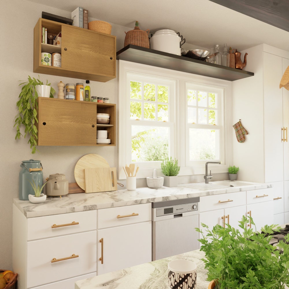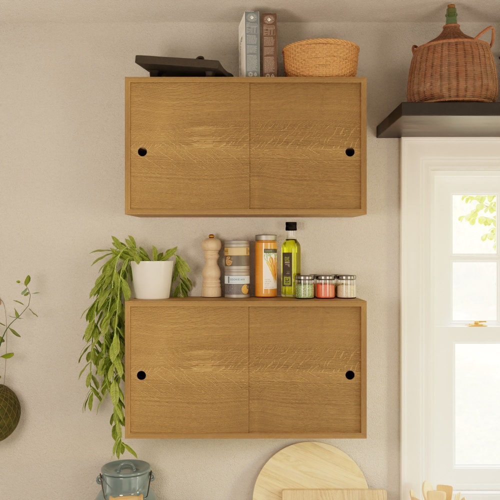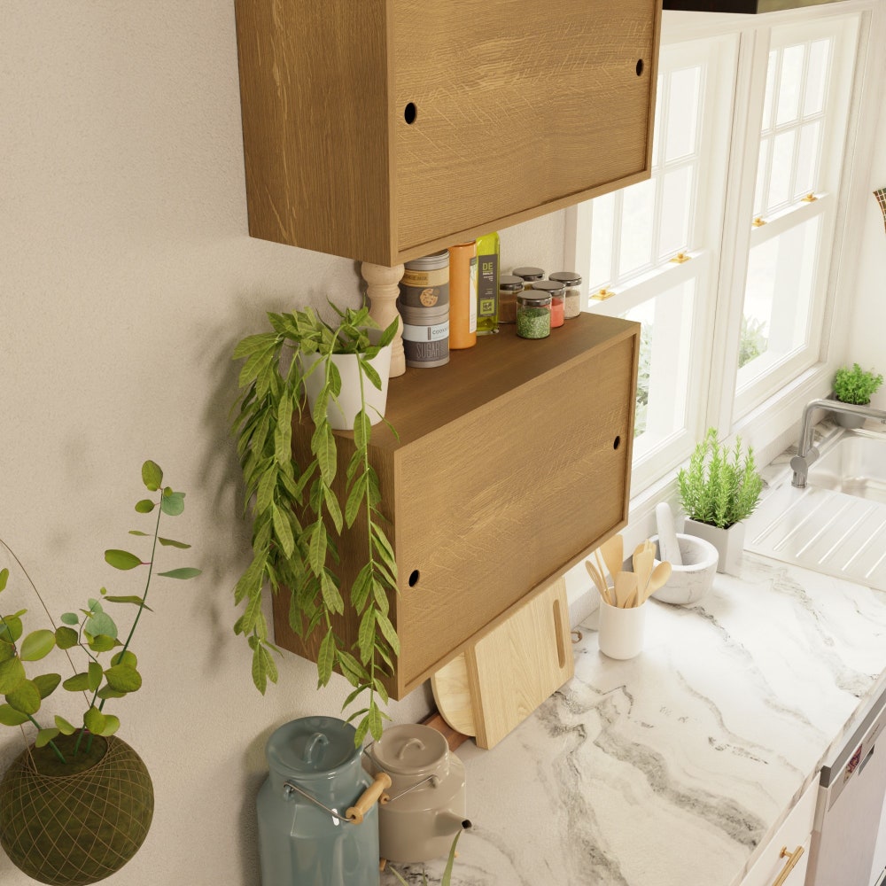 Our Floating Kitchen Cupboard is handmade from solid White Oak with matching-grain veneer sliding doors. This larger version of our standard floating storage cabinet has a fixed shelf behind the doors for versatile storage solutions for any room in your home. We build each piece from solid hardwood boards joined with a 45 degree miter creating a beautiful wrap-around continuous grain.