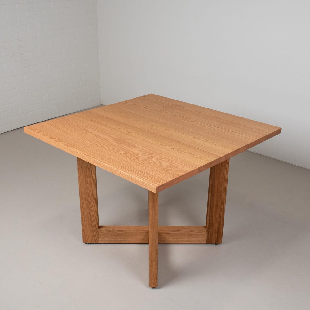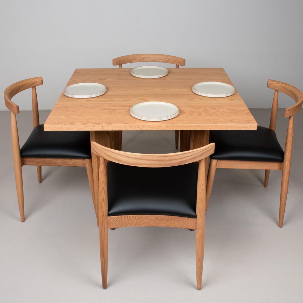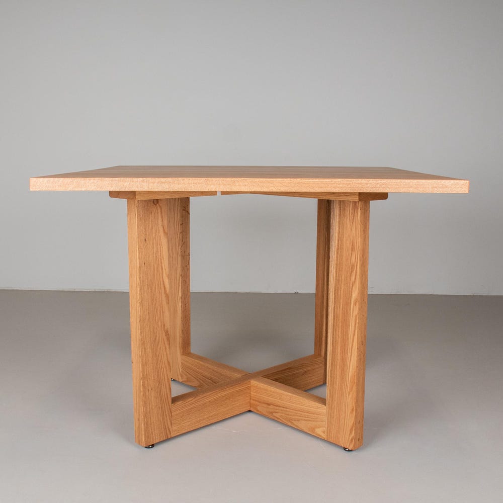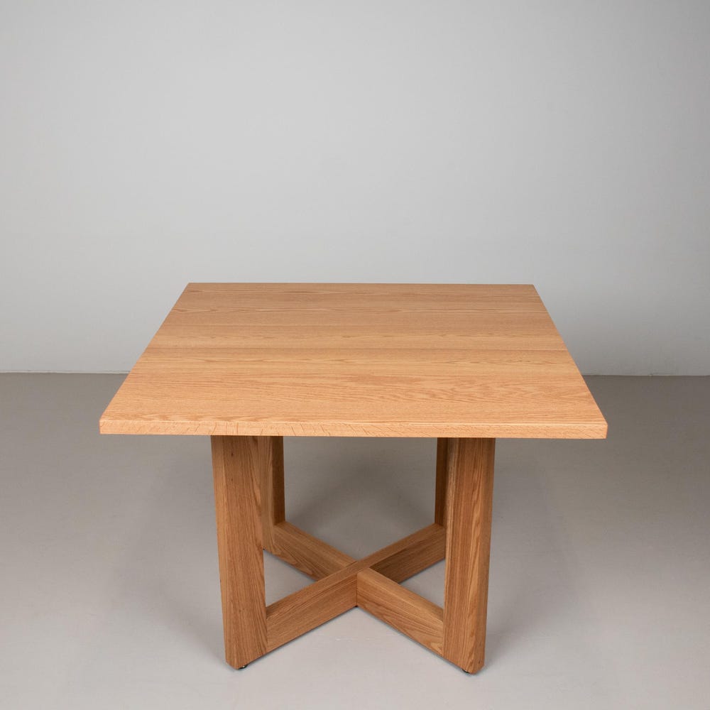 The white oak table top on this square table pairs beautifully with the oak cross pedestal base. Together they make a comfortable table that fits well into a kitchen or small dining room. The table is shown here with optional dining chairs to complete the look. They aren’t included in the pricing but message us if you’d like info on them. We build every table to order so there are many ways to make this table perfect for you.