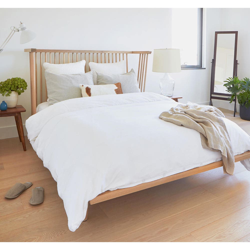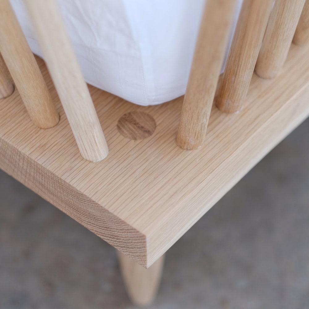 A modern take on a Windsor chair, this bed is both intimate and airy. Constructed of all solid wood and sturdy non-visible hardware, its delicate design disguises an incredibly strong, rigid frame.