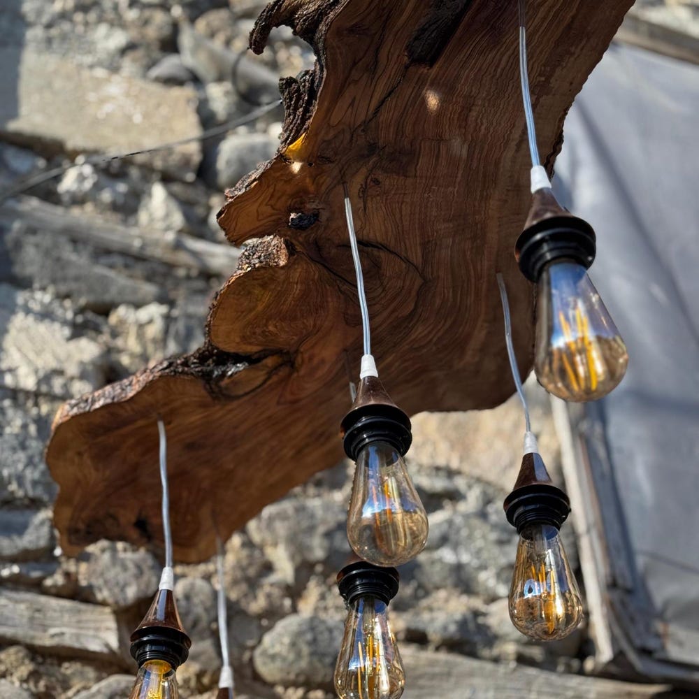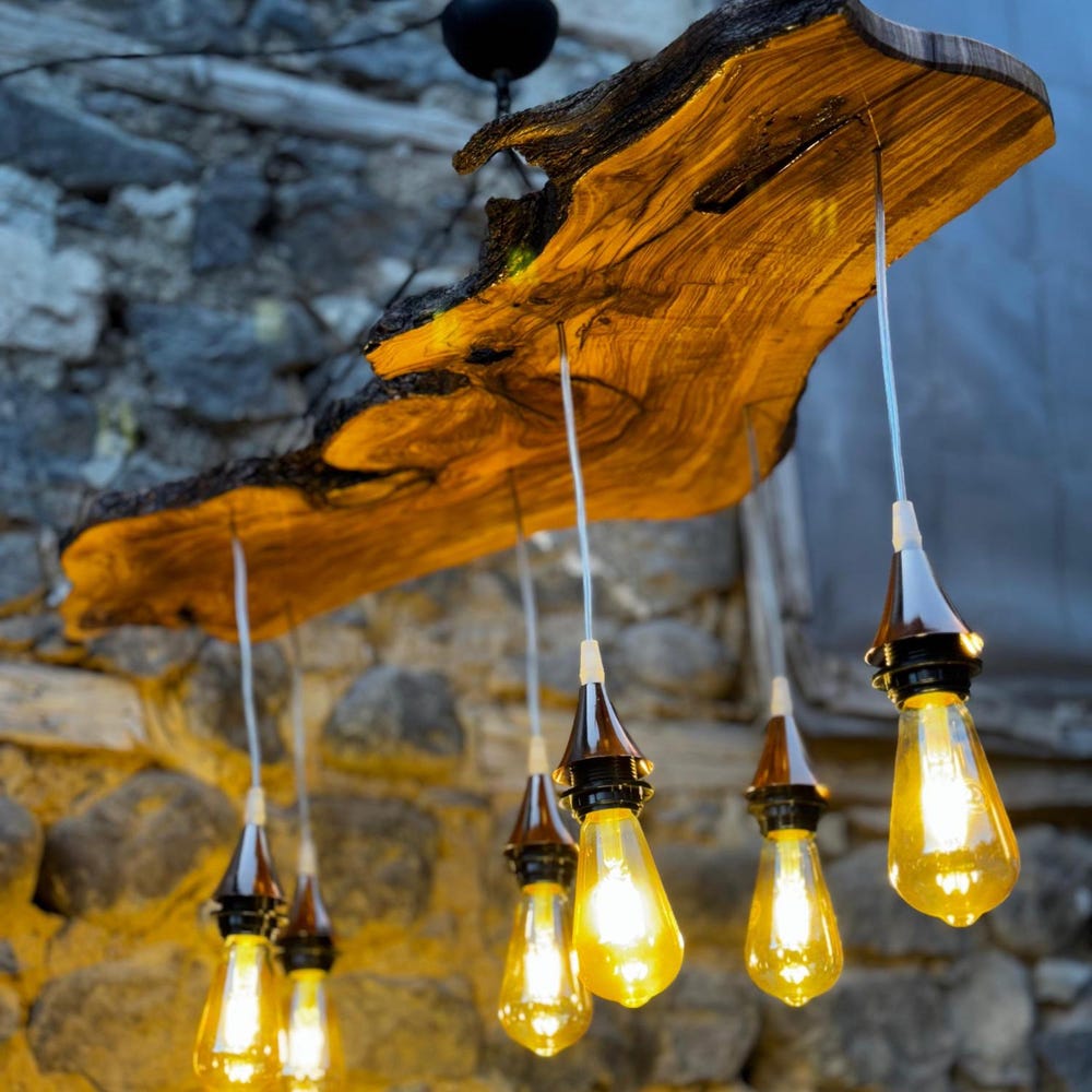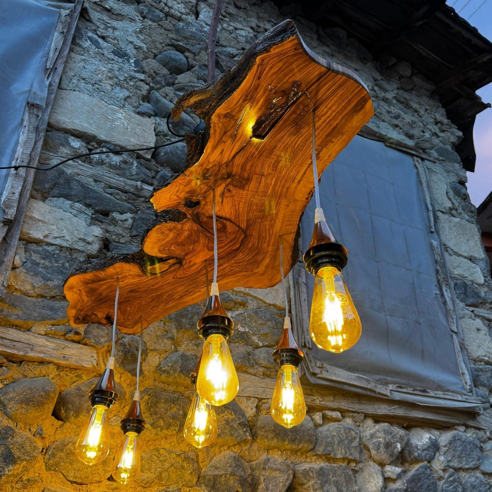 Our olive wood chandelier is handcrafted from premium, sustainably sourced olive wood, known for its rich grain and timeless beauty. The live edge design showcases the organic contours of the wood, making each piece completely unique. The natural tones of the olive wood add warmth and elegance, while the raw, unrefined edges give it a rustic charm that will complement a wide range of decor styles, from modern to farmhouse to industrial.