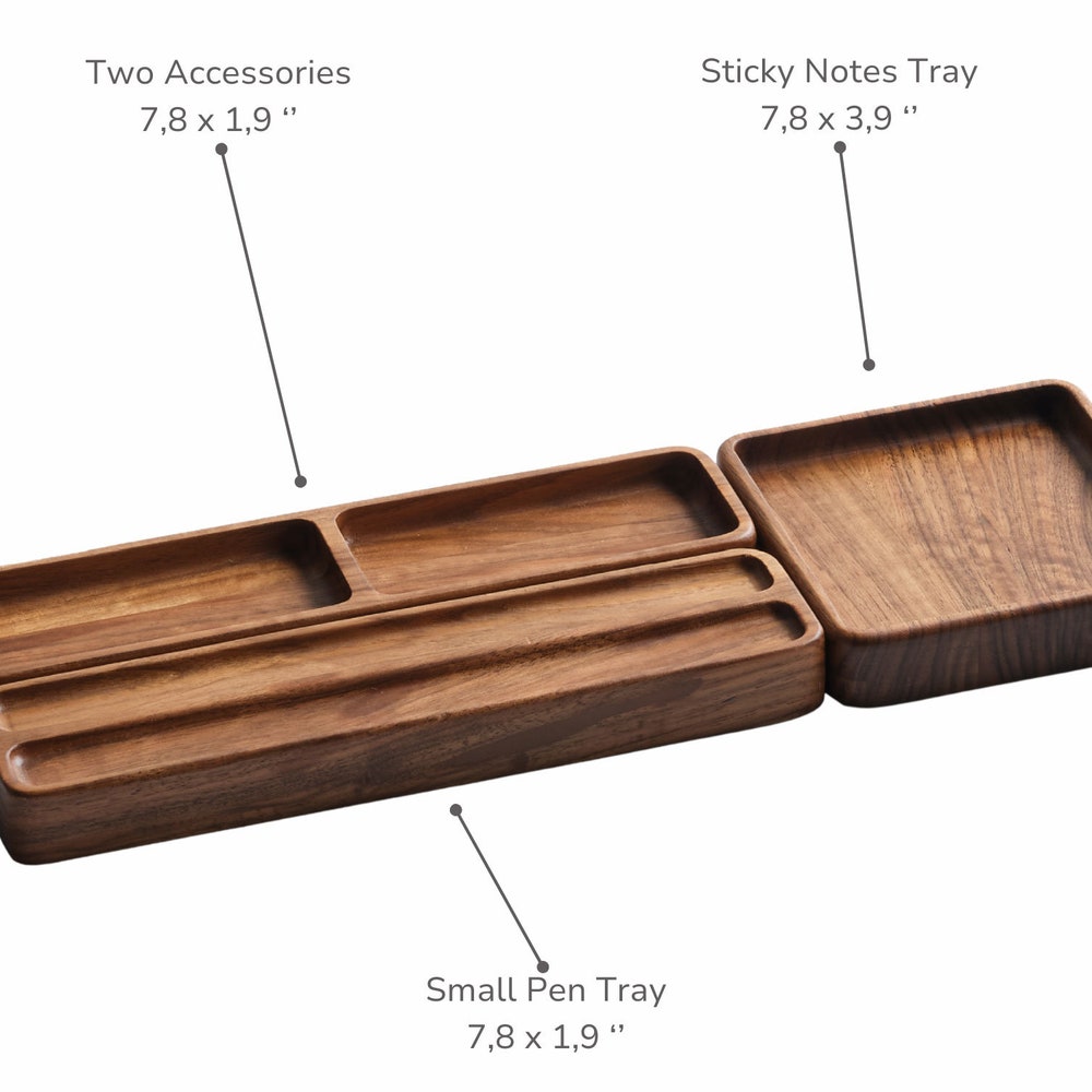 Two Accessory Trays (7.8″ x 1.9″ / 20cm x 5cm each): These compact trays are perfect for holding smaller accessories that often get lost on your desk, such as paper clips, erasers, thumbtacks, or USB drives. Their sleek design keeps everything within reach without taking up much space, adding a functional yet stylish touch to your workspace.