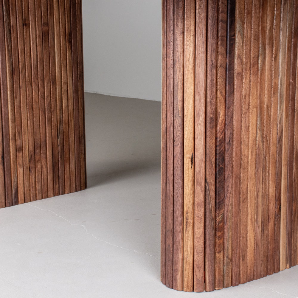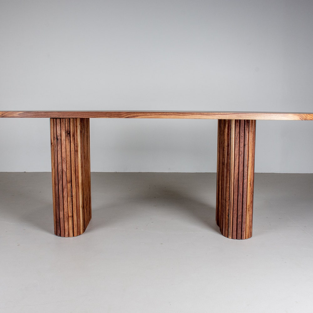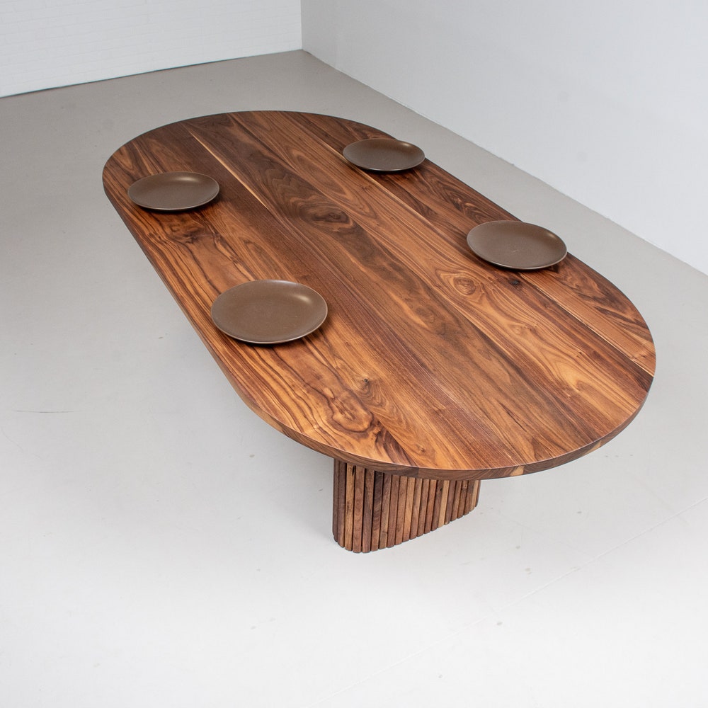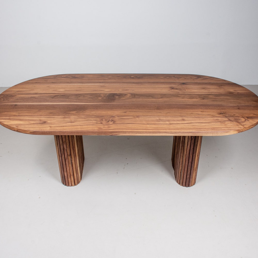 Add a touch of elegance to your dining room with this wood oval dining table. The oval shape is easy to walk around and the natural finish on the walnut wood highlights the rich warm tones of the wood. The real show stopper though is the pair of fluted walnut pillars that form the base for the table. We build every table to order so there are many ways to make this table perfect for you.
