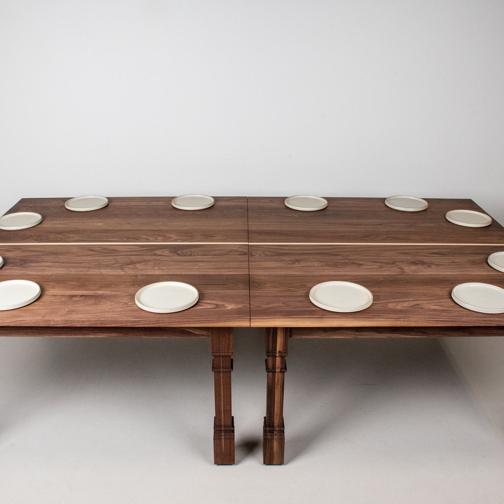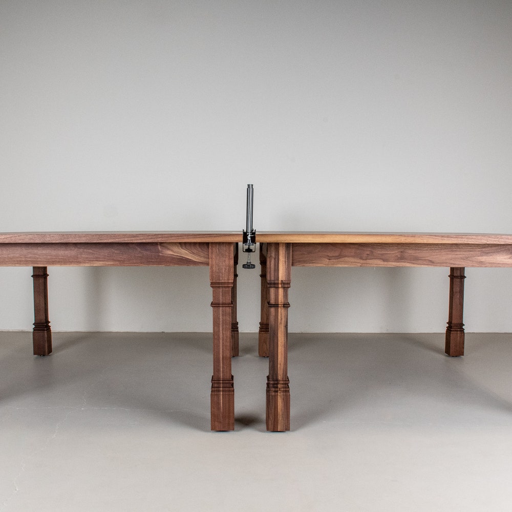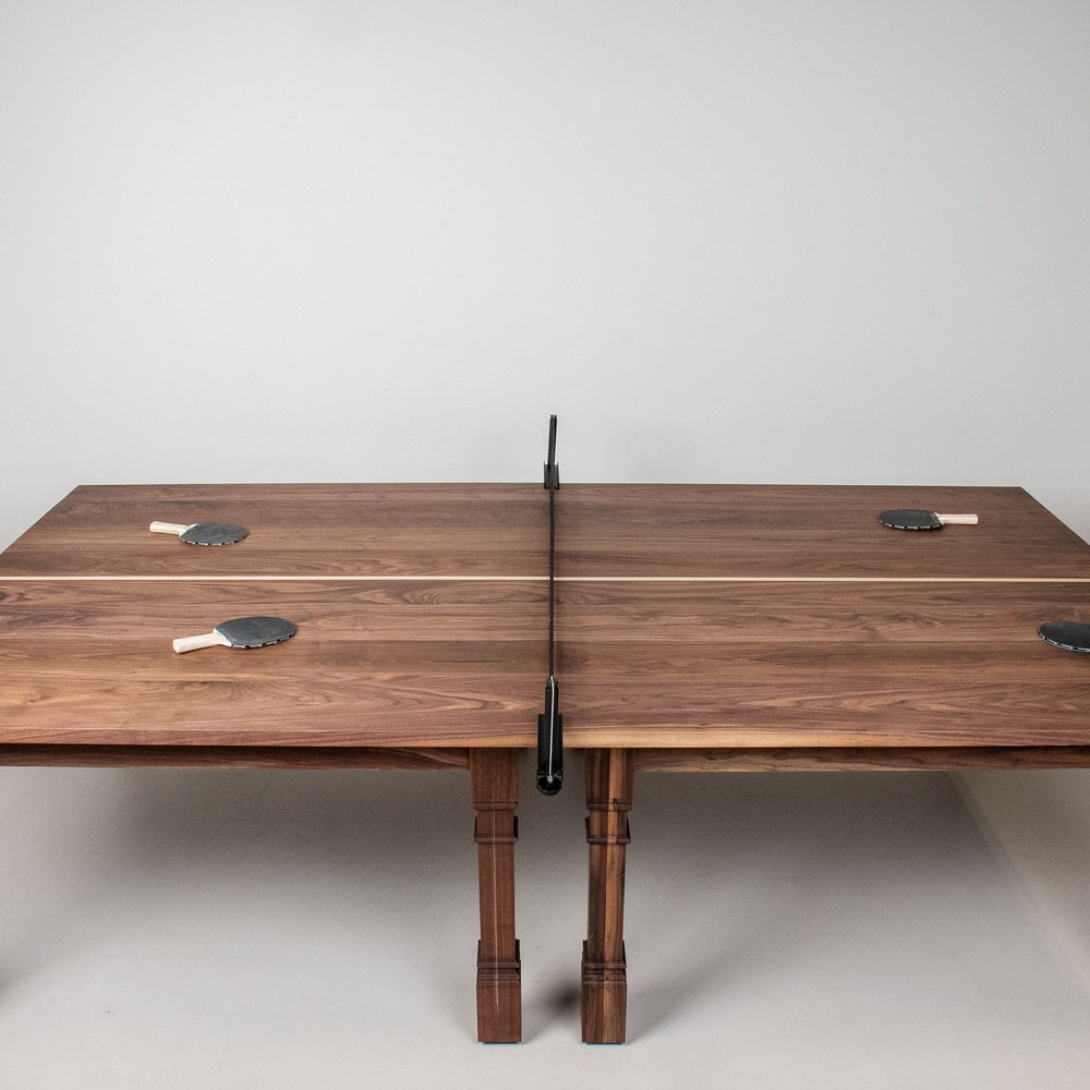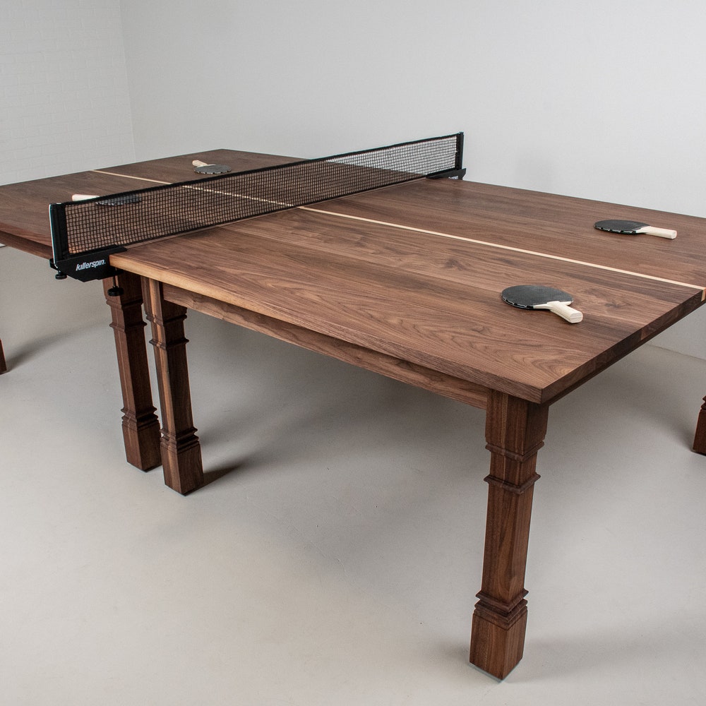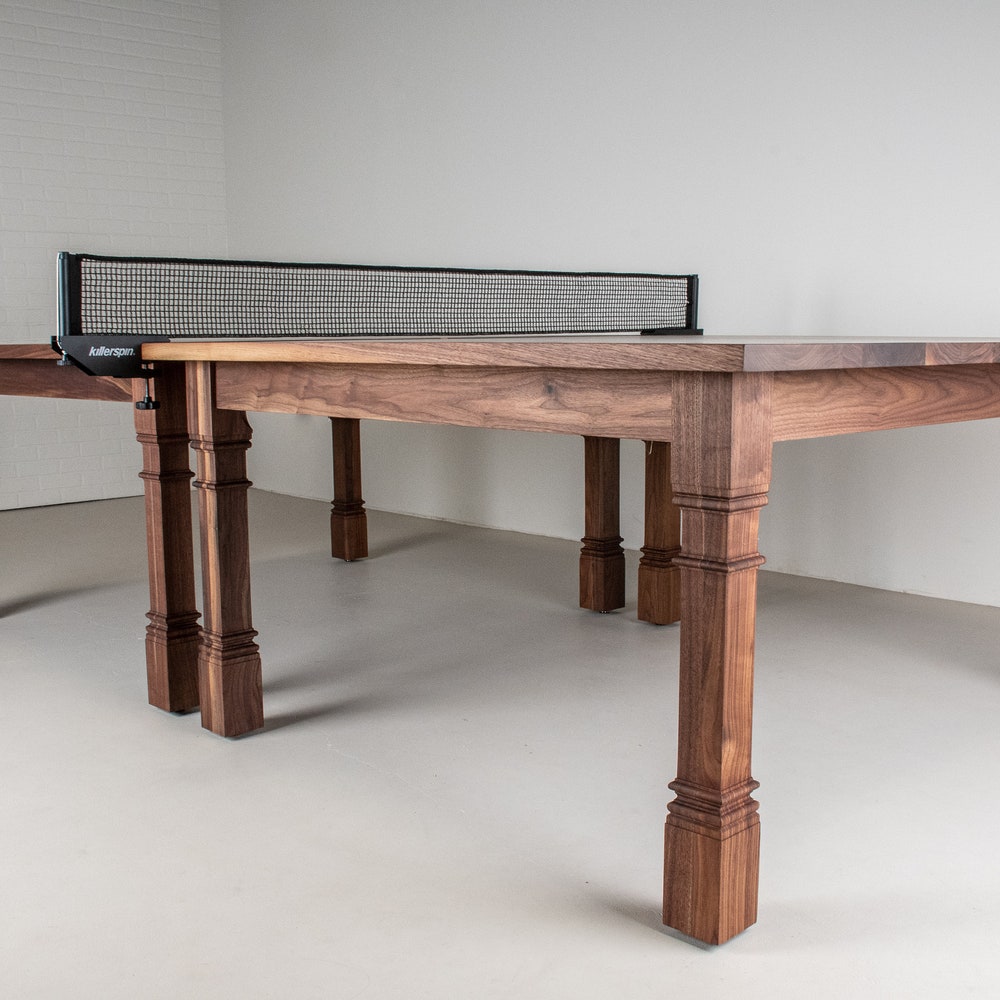 This wood ping pong table is beautiful and functional. Made of 2 separate walnut tables that can also be used as dining tables, it features turned legs that add a lot of style. We build every table to order so there are many ways to make this table perfect for you.