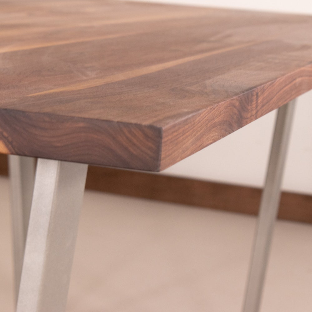 Solid natural walnut is the star of this wood table top. Walnut has beautiful coloring and grain and our all-natural finish highlights the fact that the table top is made of real walnut wood, not particle board with a walnut veneer. Paired with nickel colored steel legs, this table is as sturdy and strong as it is beautiful. We build every table to order so there are many ways to make this table perfect for you.