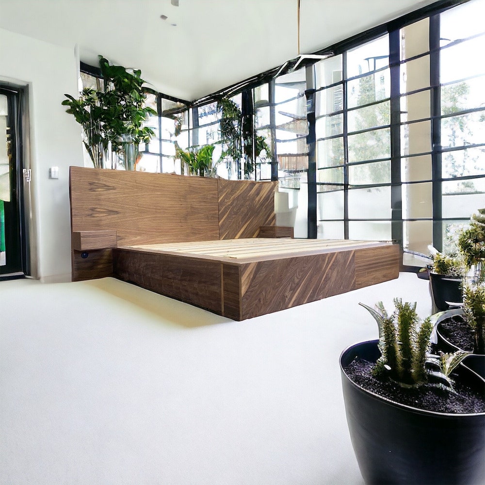 Bed Frame King Gift for Couple – Walnut Patchwork Floor Bed for Bedroom Decor – Platform Bed Frame Handmade Furniture – Queen Bed Frame