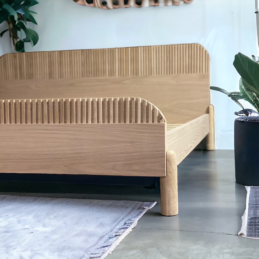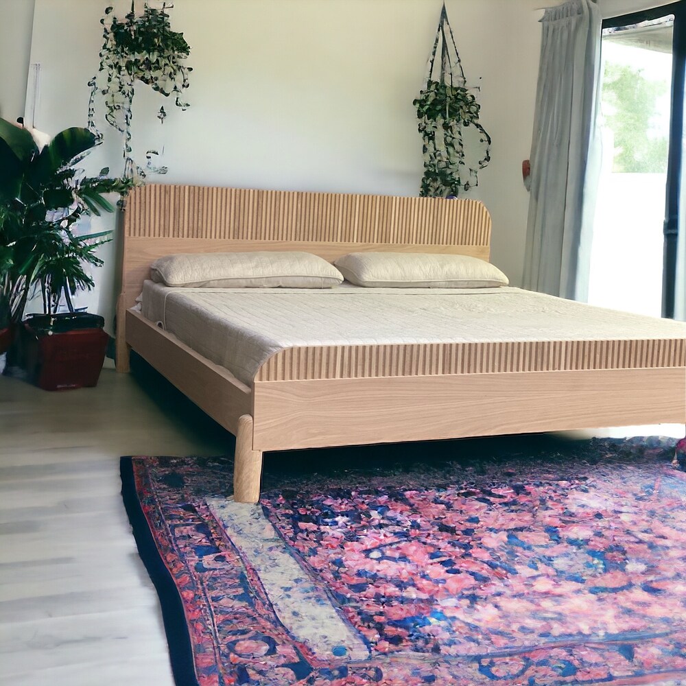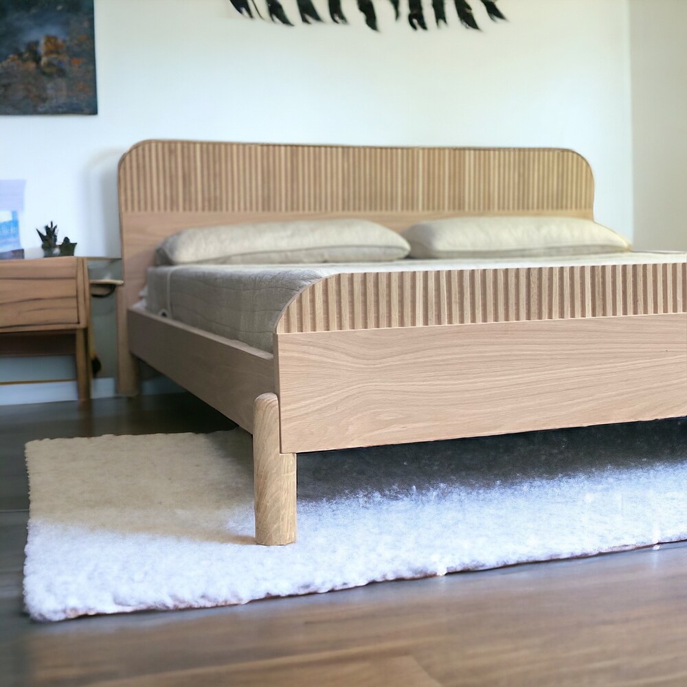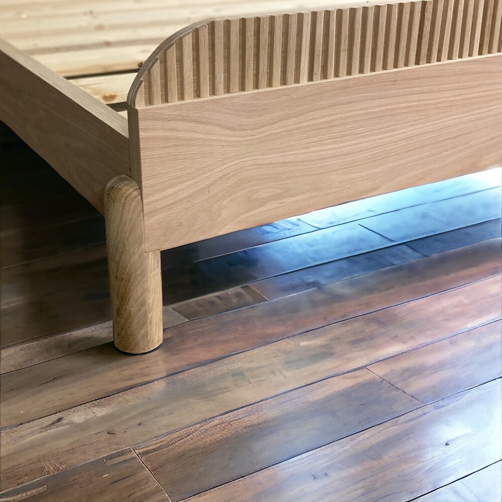 “Louette” Wooden Bed Frame, a perfect housewarming gift or timeless addition to any aesthetic bedroom space. This twin or king bed frame, handcrafted from white oak with hand-lathed oak legs, offers a blend of modern simplicity and craftsmanship, making it ideal for contemporary or rustic homes.