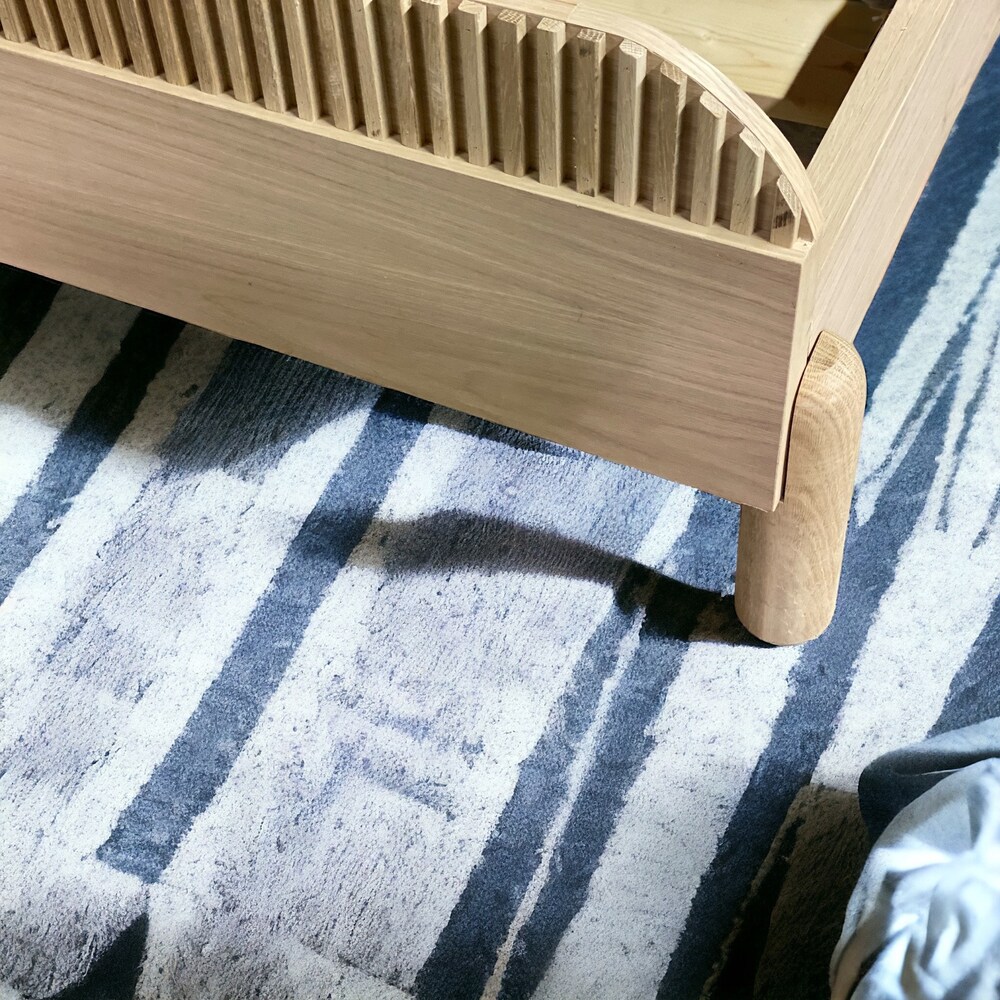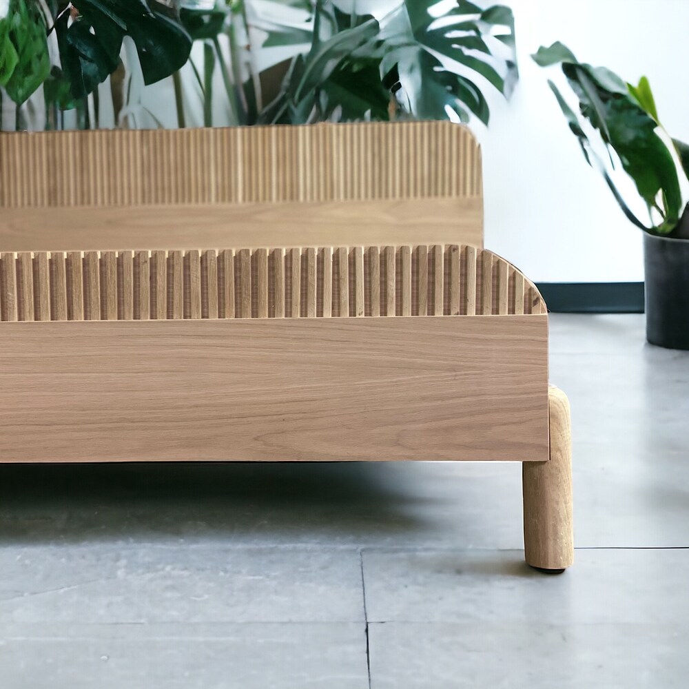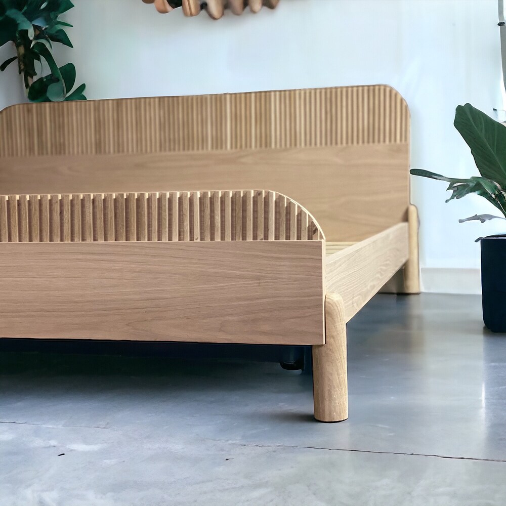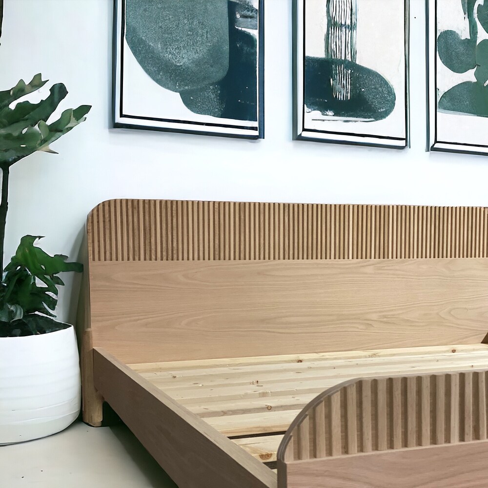 “Louette” Wooden Bed Frame, a perfect housewarming gift or timeless addition to any aesthetic bedroom space. This twin or king bed frame, handcrafted from white oak with hand-lathed oak legs, offers a blend of modern simplicity and craftsmanship, making it ideal for contemporary or rustic homes.