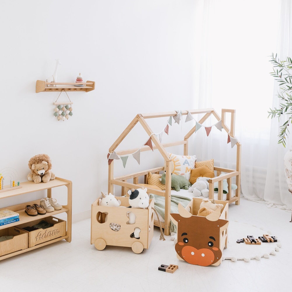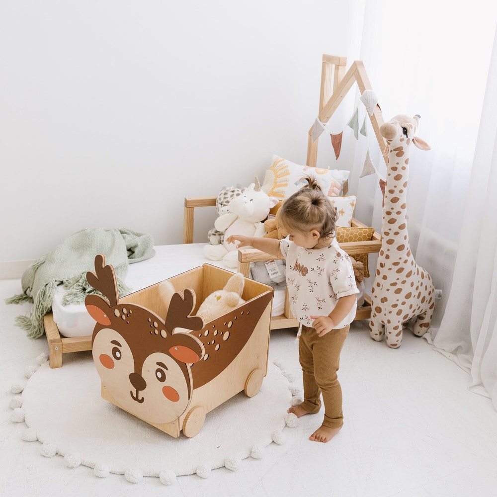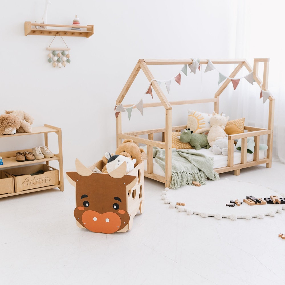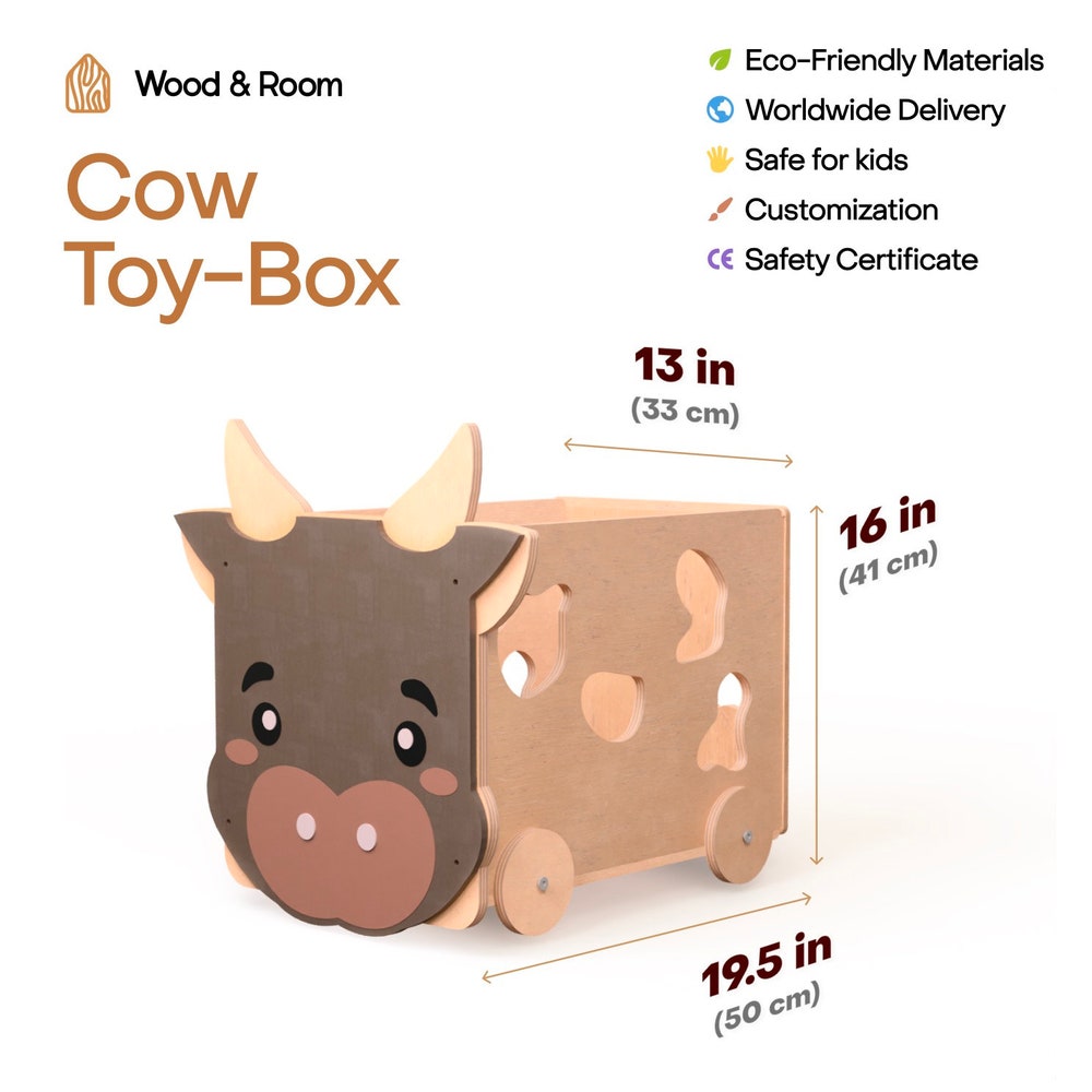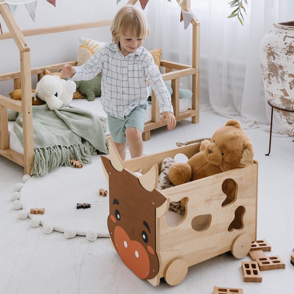 Wooden Box on Wheels, Baby and Toddler Toys Storage, Montessori furniture, Woodland Nursery, Cow Toy Box, Farm First Christmas Toddler Gift