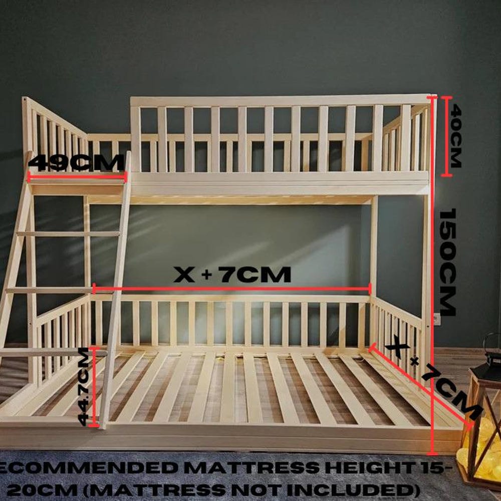 Introducing the Handcrafted Wooden Bunk Bed from Eco Kids Universe — the perfect blend of style, safety, and functionality for your childrens’ room. This thoughtfully designed bunk bed features a smaller upper bed with safety rails, providing peace of mind while your child sleeps. The lower bed is slightly bigger in size with no weight limit, making it ideal for parents who want to co-sleep with their children or for siblings who need extra space.