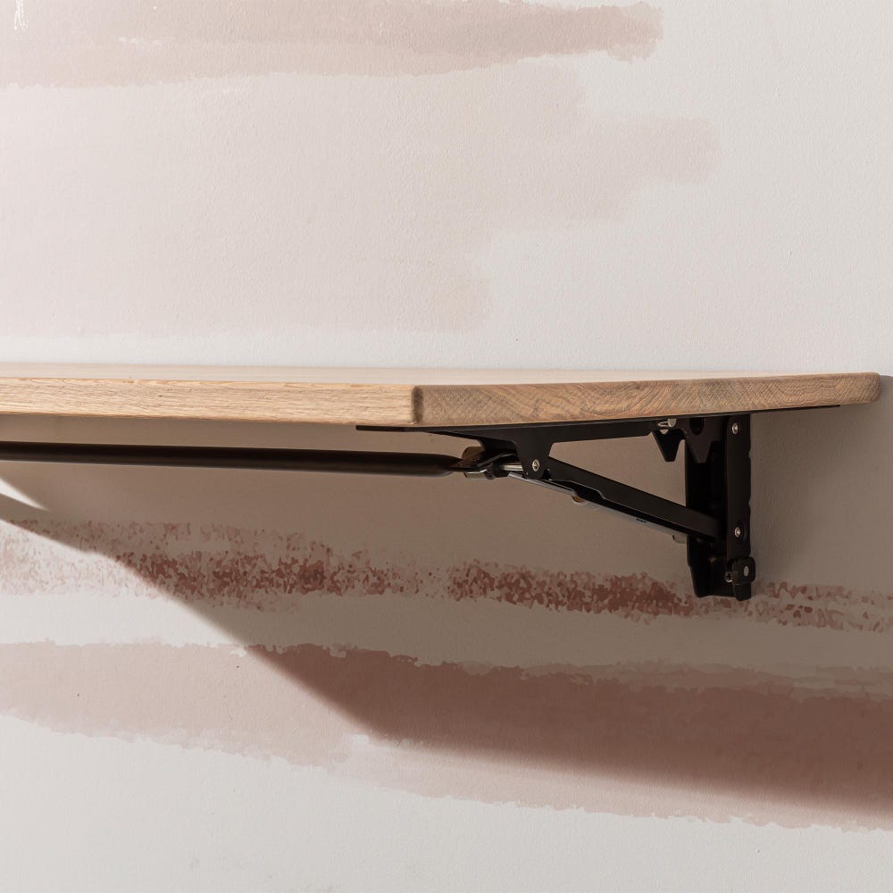 Wall Mounted Wooden Desk/Table easily folds down using the hardware included. To fold it down, simply pull up the handle on the shelf supports, and the table will easily fold down. To fold it, simply lift the front end of the table slightly until the shelf supports automatically lock into place.