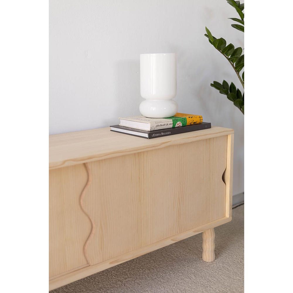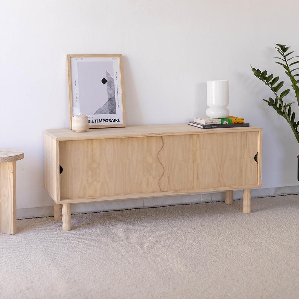 Solid wood media console, handcrafted from natural solid pine wood with PEFC certification for sustainability and durability. This TV cabinet features sliding wooden doors and a simple line design that perfectly combines Scandinavian style with a Mediterranean essence. Add a natural, warm and welcoming look to your living room!