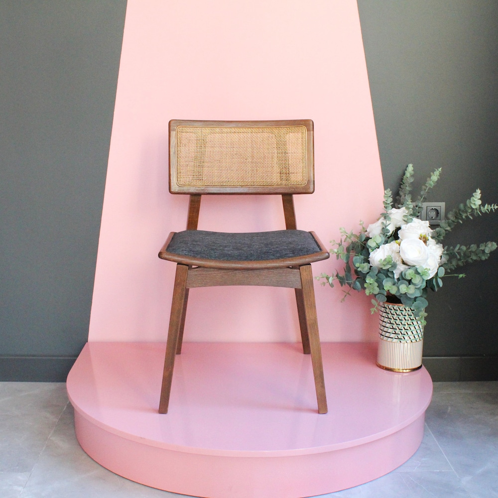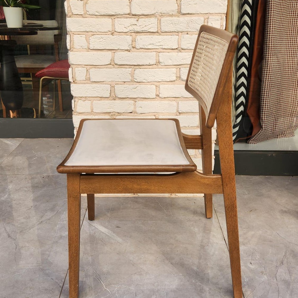 Its raw material is hornbeam tree. It is polished in its natural color. It will add color to your living room or dining room with its rattan details. It can be lacquered from walnut wood in black and natural colors. Fully customized fabric colors are available.