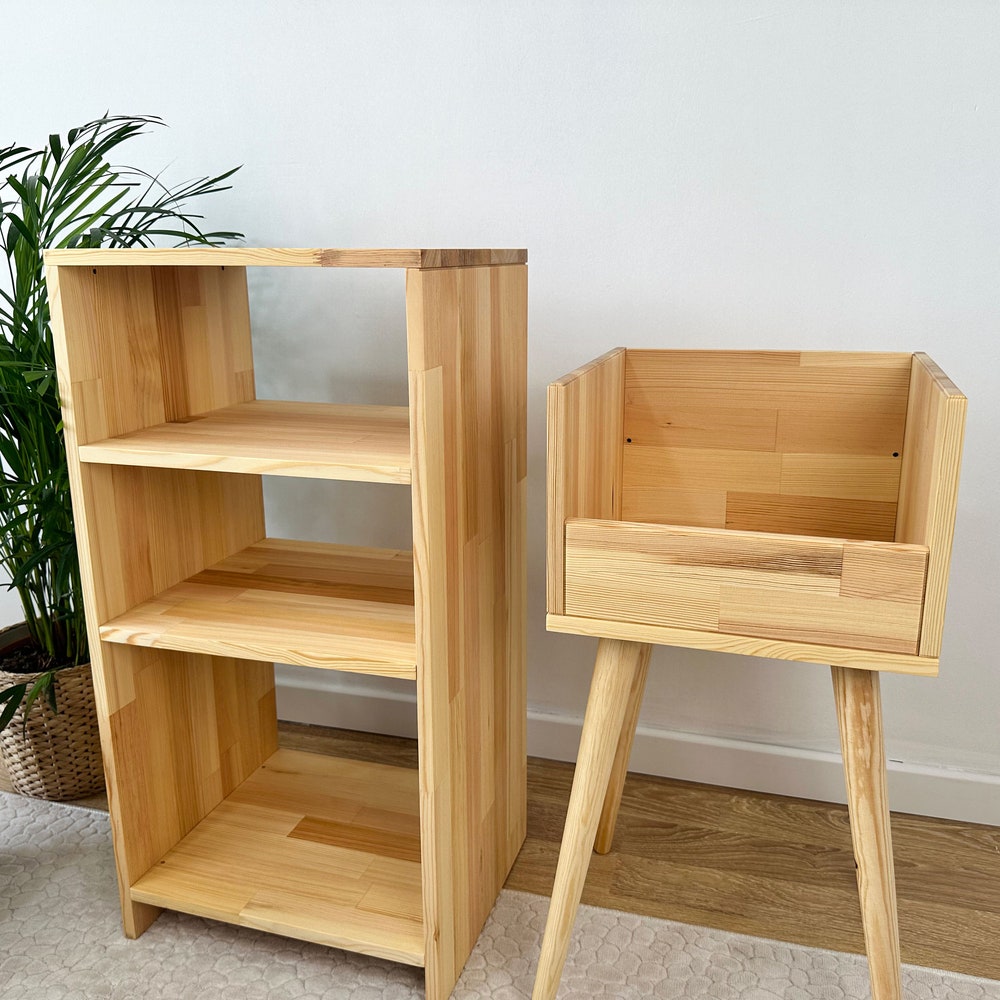 This turntable stand is meticulously crafted from 100% pine wood, showcasing our dedication to craftsmanship. We offer four wood options: pine, oak, walnut, and birch plywood. You can see the wood options and color choices in the photos. We aim to bring quality and elegance to your home by translating our impeccable craftsmanship into furniture.