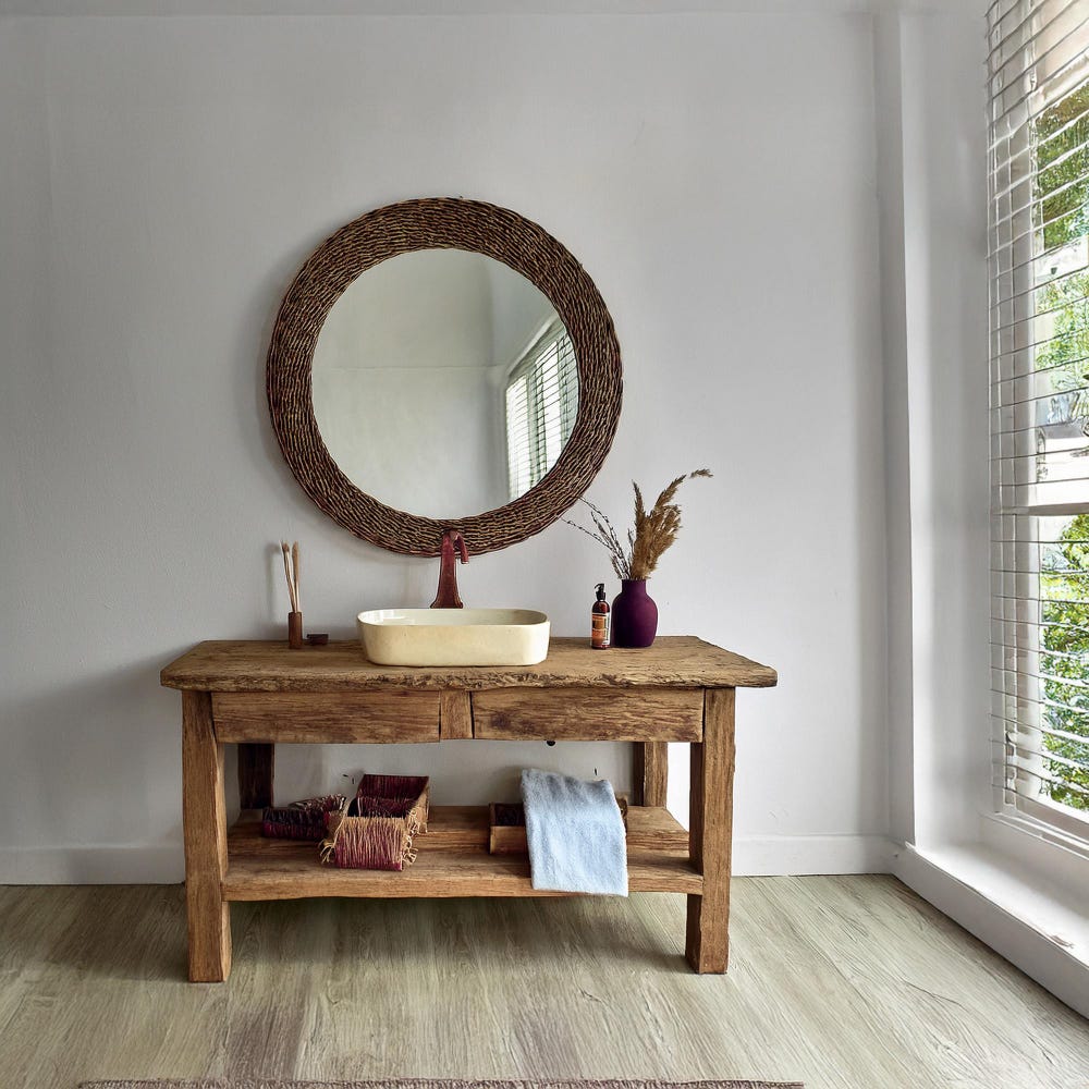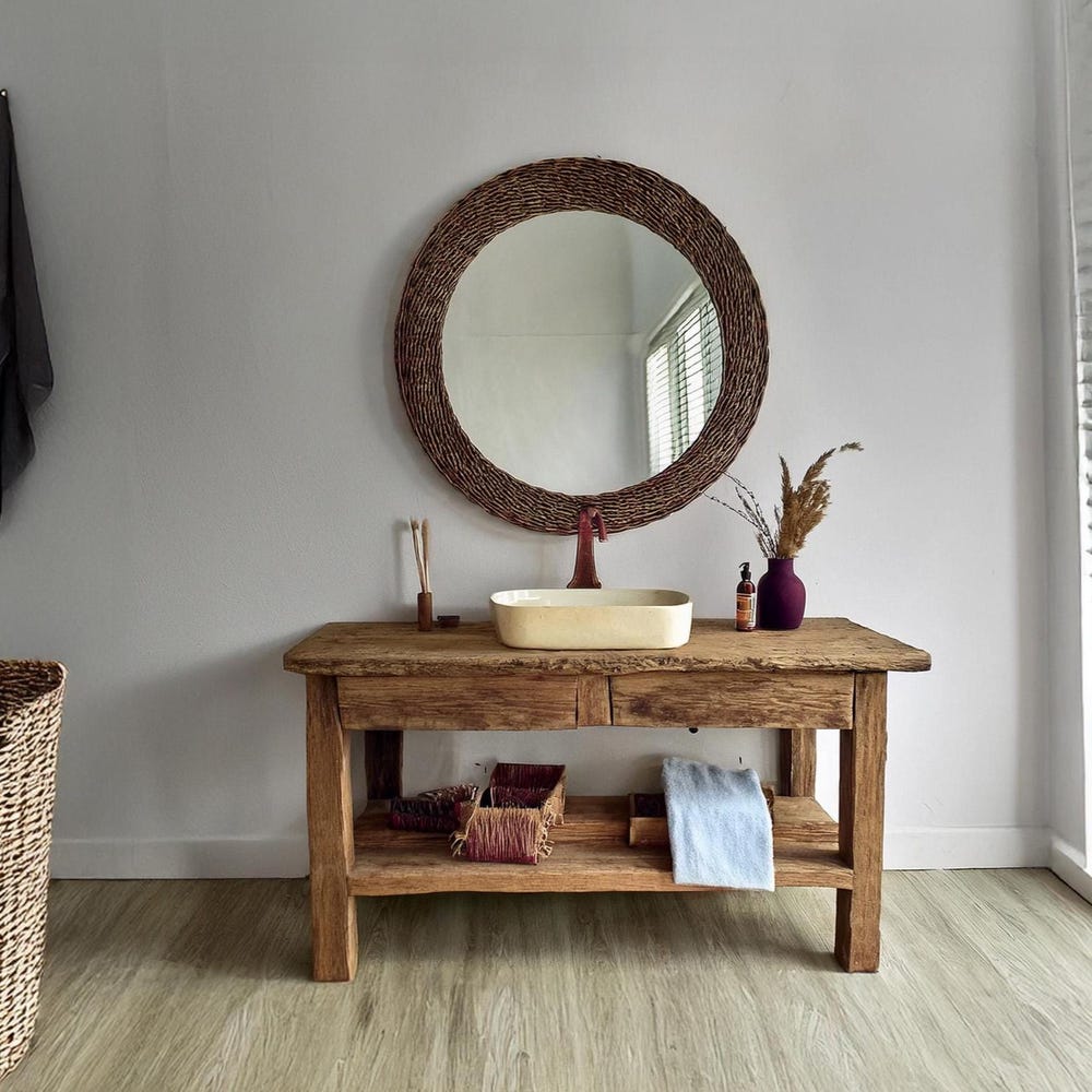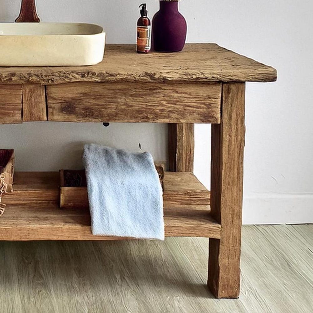 Transform your bathroom into a rustic haven with our handcrafted bathroom vanity. Made from solid wood, this unique piece features natural edges and a rich texture, ensuring that no two vanities are alike. Perfect for farmhouse decor, it combines style with functionality, providing a stunning centerpiece for your space. Ideal for those seeking both aesthetic appeal and durability