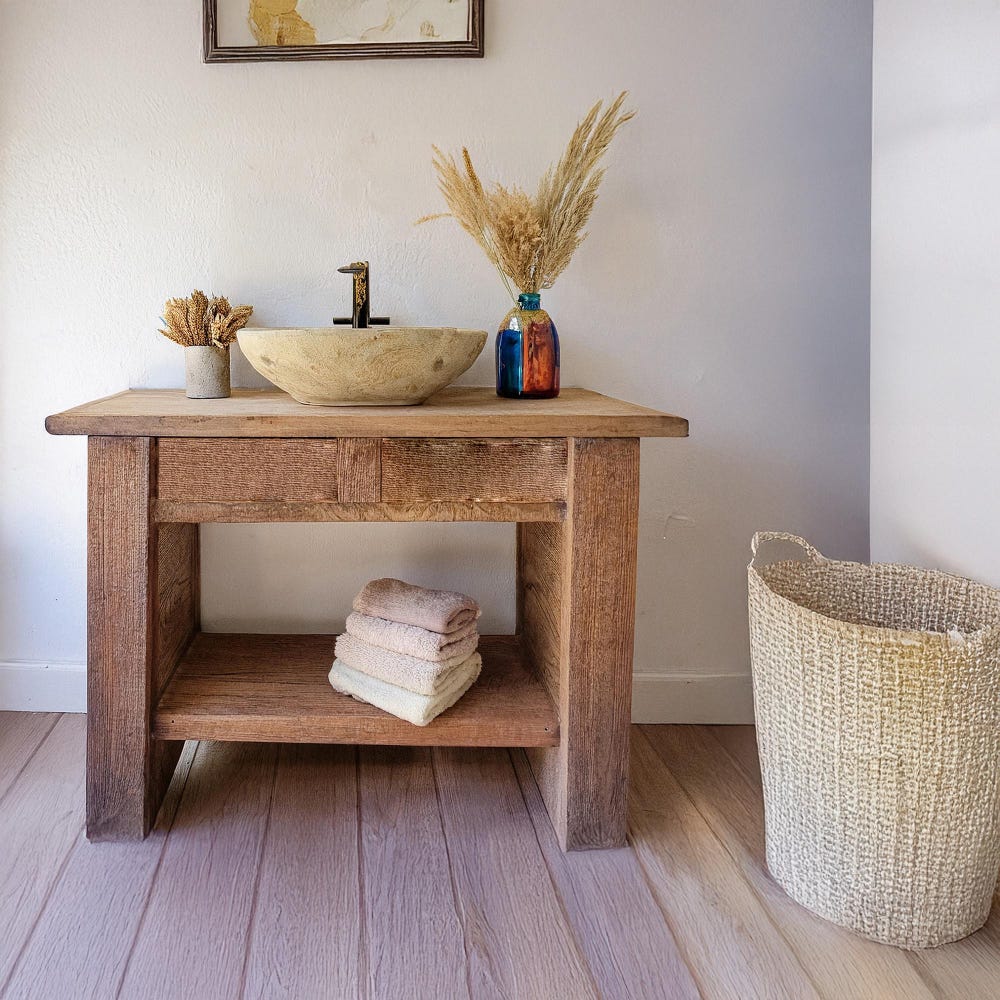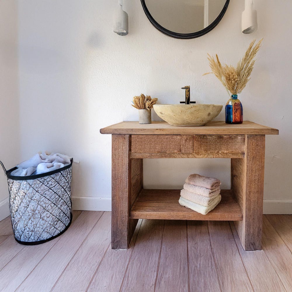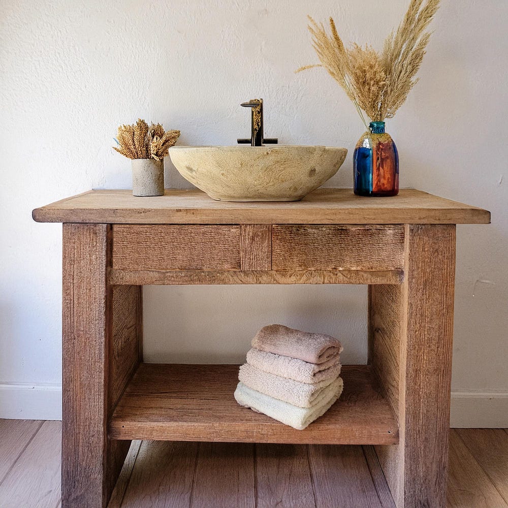 wooden rustic live edge bathroom vanity farmhouse decor reclaimed old solid wood table counter top sink shelf handcrafted furniture cabinet