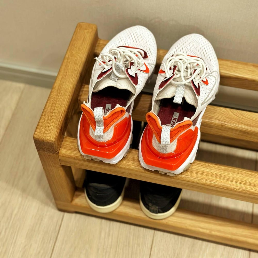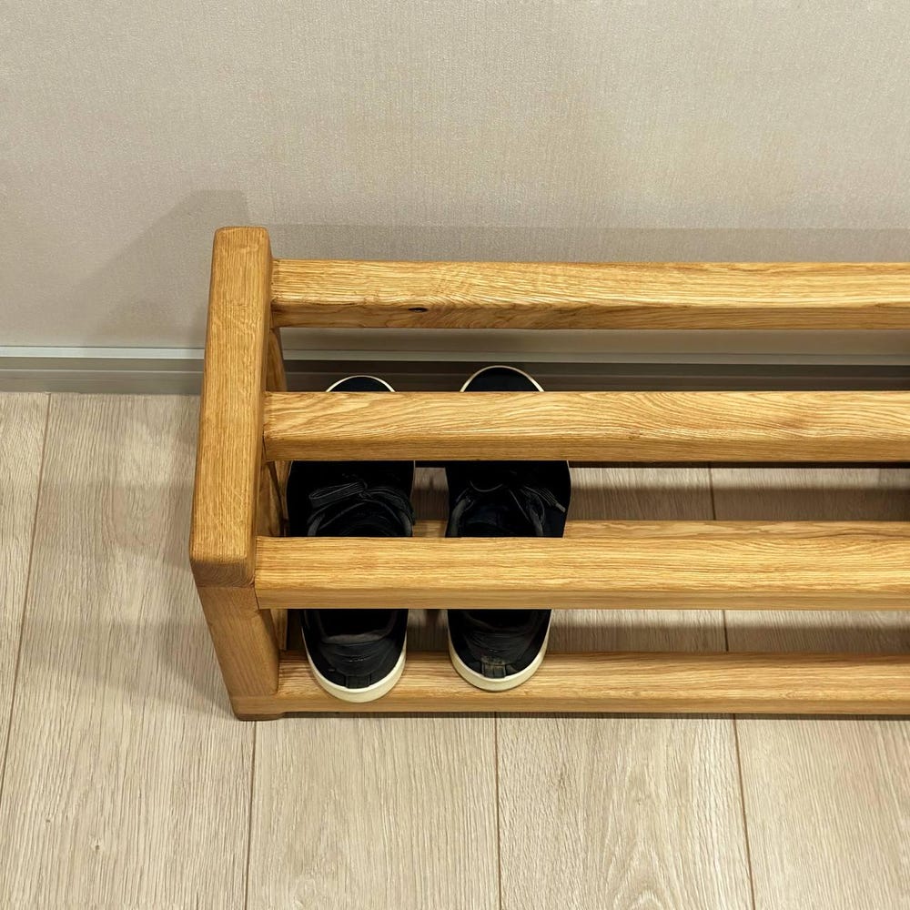 The shelf has two tiers for storing shoes.
