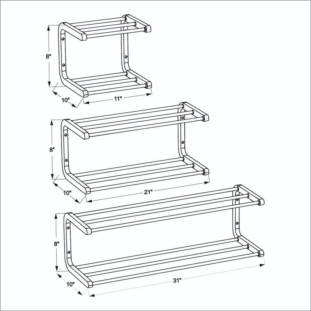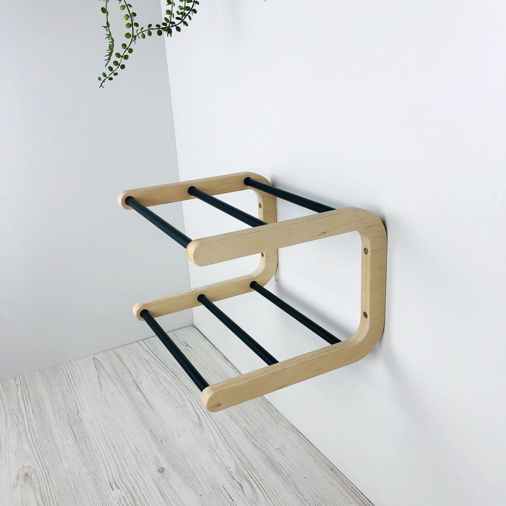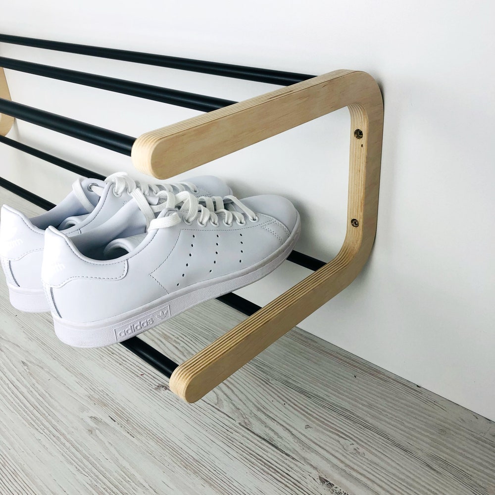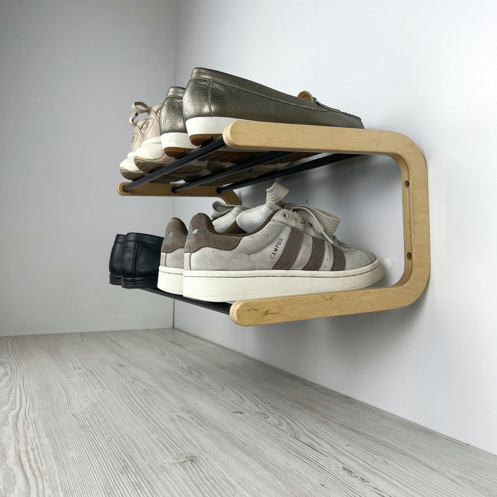 This sleek wall mounted shoe rack is designed to optimize space in your entryway. Simple to install, it is constructed from plywood with aluminum steel rods, weighing a mere 1.5 kg, yet it is strong and durable. Ideal for storing shoes in the closet or for long-term use in your entryway. Enjoy the quick installation process—it will be set up in no time!