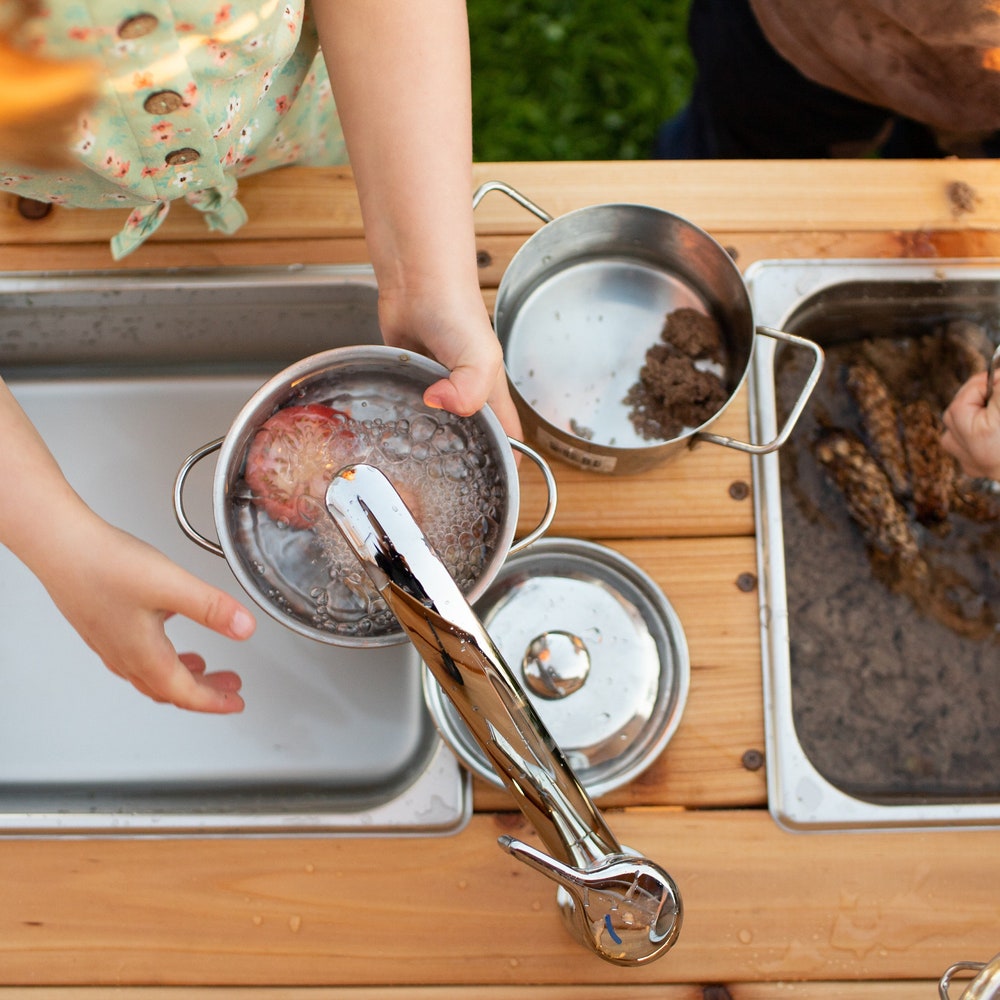 We love mud kitchens because children are free to get as messy as they want – since they are outdoors of course! Sensory, messy and pretend play is SO good for children. There are endless possibilities with these lovely mud kitchens as they promote open-ended play: mud soup, a pretend cafe, or filling the sinks with sensory items are just a few examples!